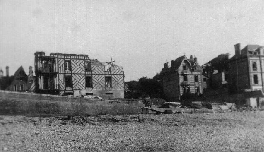 « En 1942, je pus aller aux Petites-Dalles avec oncle Georges, entre deux passages de troupes allemandes, pour essayer de sauver ce qui pouvait l’être, tant aux Mouettes qu’aux Chrysanthèmes : train jusqu’à Yvetot, taxi jusqu’à Sassetot où l’hôtel du Commerce (actuelle pharmacie) nous accueillit au soir de notre arrivée. Ah le bon dîner : soupe, omelette, confiture et pain presque à volonté ! Le lendemain, tout ce qui était transportable : meubles subsistants, piano des Mouettes, quelques chaises, fut mis en sûreté (relative) chez Mme Beaufils, la blanchisseuse, notre gardienne. Tout ce qui relevait du « petit mobilier », porcelaine, linge de maison, etc. avait disparu. L’annexe des Chrysanthèmes s’ornait d’un écriteau : « Kommandantur ». Cela nous a valu de ne pas être trop démoli ! Au bord de mer, l’hôtel des bains, la tour de pierre, les villas les plus proches de la plage (Guibert, Rolland, Lancrenon) étaient en partie en ruines. »