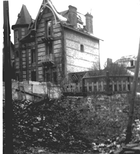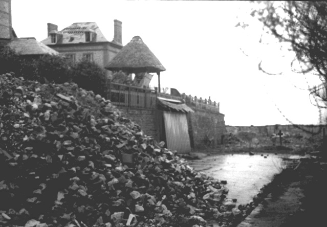 Et voici que, dans le jardin des Chrysanthèmes, nous découvrons les poiriers en espalier le long du mur, couverts de fruits ! Oncle Georges se pencha pour en cueillir lorsque j’aperçus sous son talon, une petite fumée jaillissante… une petite mine qui, mouillée, avait « foiré ». Jamais nous n’avons couru aussi vite ! Le terrain était entièrement miné en rangées écartées de 2 mètres les unes des autres, les mines se succédant de mètre en mètre ; du bon travail ! Il a fallu laisser nos belles poires, bien marris de l’histoire. La vieille route de Saint-Martin (au-delà de la maison des Perpillou) était traversée par un énorme fossé antichar qui traversait toute la vallée des Dalles, les avenues et aboutissait à la ferme des Bruyères. Le tout également miné. Les maisons du bord de mer étaient en ruines, pires qu’avant. Beaucoup de toits délabrés, les poutres des toitures avaient été enlevées. Mais le pays était libéré et la vie pourrait reprendre, cahin-caha (après déminage). Mais les Mouettes et les Chrysanthèmes étaient encore debout. Et ce fut le retour sur Paris, par une pluie battante, pédalant dans le brouillard, trempés, exténués. »