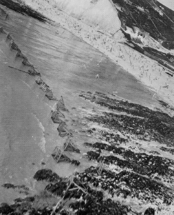 Pour protéger la côte d’un éventuel débarquement des alliés, les falaises s’ornèrent alors de « bunker » en béton et les plages furent truffées d’obstacles dont on retrouve encore actuellement parfois des restes dans les rochers. Plus de 50 ans après on retrouve encore notamment des blocs de béton qui servaient de mines et dans lesquels étaient enfouies des munitions. Ces blocs peuvent être dangereux.Il s’agit, ci-contre, d’une photo exceptionnelle de la plage des Petites-Dalles prise en mai 1944 par un avion de reconnaissance américain, un P38, et publiée en 1984 par la revue d’histoire aéronautique Icare dans un numéro consacré au Débarquement (tome 2, page 88). (Document aimablement adressé par Pierre-François Mary).